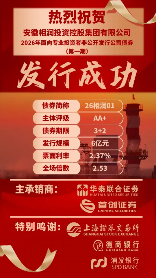近日,首创证券担任联席主承销商助力安徽相润投资控股集团有限公司(简称“相润投资”)成功发行2026年面向专业投资者非公开发行公司债券(第一期)。本期债券发行规模6亿元,发行期限为5(3+2)年,票面利率2.37%,全场倍数2.53倍。